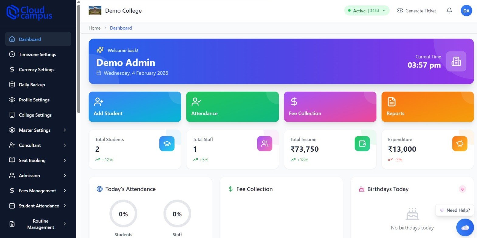 This highly configurable system provides 100% Data Security & Privacy and serves as a step towards a paperless system. Key features include Admission Management, Fees Management, Attendance Management, HR Management, and Secured Payment Gateways.